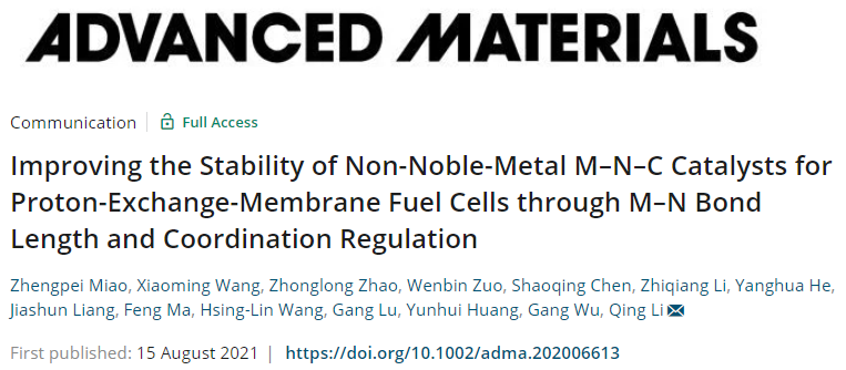 Improving the Stability of Non-Noble-Metal M–N–C Catalysts for Proton-Exchange-Membrane Fuel Cells through M–N Bond Length and Coordination Regulation,Advanced Materials,2021.