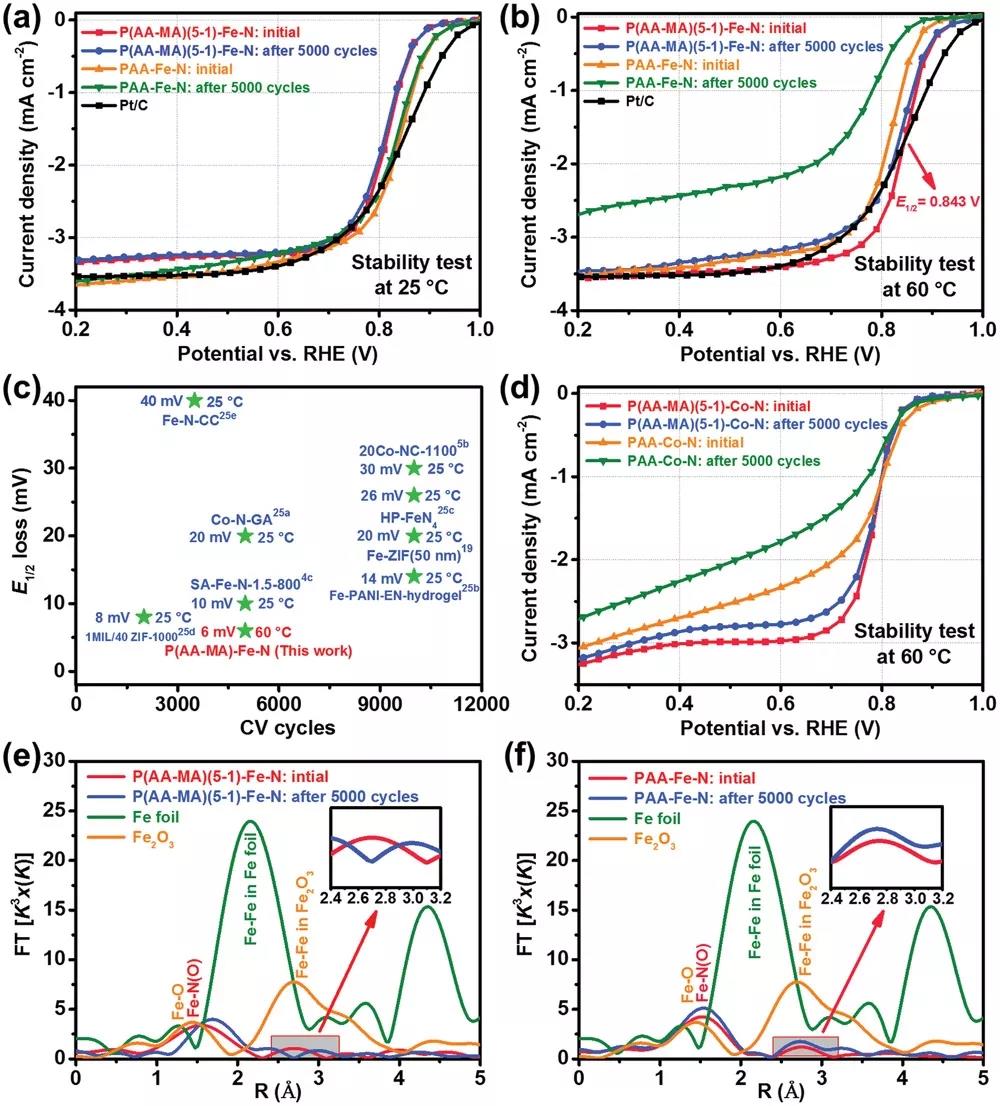 用旋转环盘电极(RRDE)在0.5 M H2SO4溶液中、25℃下评估了催化剂的电催化活性和稳定性。如图4a所示,PAA-Fe-N催化剂的半波电位(E1/2)为0.822 V。当MA引入后,P(AA-MA)-Fe-N和MA-Fe-N催化剂的ORR活性均显著提高。其中,P(AA-MA)(5-1)-Fe-N催化剂的最佳E1/2,为0.843 V。随后评价了催化剂的稳定性。在25℃下,P(AA-MA)(5-1)-Fe-N和PAA-Fe-N催化剂在加速稳定性测试(AST)中表现出极佳的稳定性,在饱和O2的0.5 M H2SO4中经过5000次电位循环(0.6~1.0 V)后,仅分别有3 mV和5 mV的E1/2衰减。进一步测试了60℃下的稳定性(图4b)。值得注意的是,PAA-Fe-N催化剂的E1/2和极限电流密度在60℃下经过5000次电位循环后发生显著降低,分别降低约60 mV和1.0 mA cm-2。这表明在高温下PAA-Fe-N中Fe-Nx/C活性位点并不稳定。重要的是,MA的存在可以大大提高催化剂的稳定性。在60℃下经过5000次电位循环后,P(AA-MA)(5-1)-Fe-N催化剂表现出非常高的稳定性,E1/2和极限电流密度的损耗可以忽略不计。结果表明,以Fe-N4/C为主、Fe-N键较长的P(AA-MA)(5-1)-Fe-N催化剂在类似于PEMFC的条件下仍能保持其结构完整性。