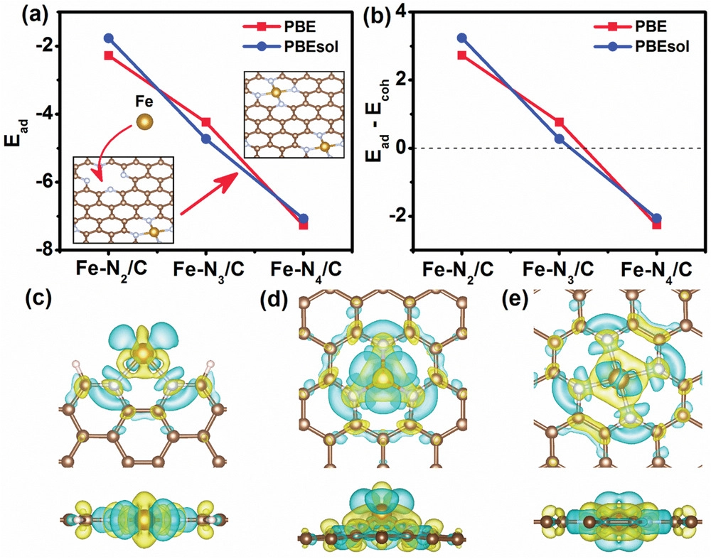 为了进一步探究P(AA-MA)(5-1)-Fe-N和PAA-Fe-N催化剂稳定性差异的根源,采用DFT计算Fe原子在载体上的吸附能(Ead)以及Ead与体内聚能(Ecoh)的差值(Ead-Ecoh)。图6a、b为计算得到的Fe-N2/C、Fe-N3/C和Fe-N4/C结构的Ead和Ead-Ecoh值。由于Ead值为负,这三种结构都是稳定的。而Fe-N2/C和Fe-N3/C具有正的Ead-Ecoh值,表明它们对金属团聚的稳定性较Fe-N4/C低。在三种催化剂中,Fe-N4/C对抗金属离子浸出、团聚的效果最好。