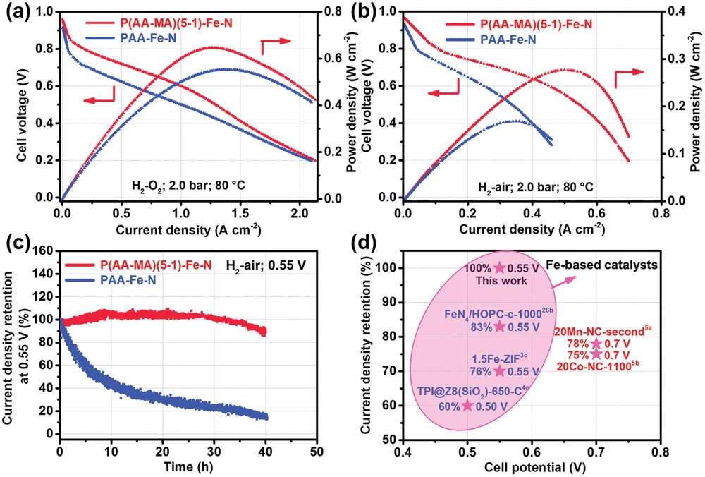 在H2-O2燃料电池中,与RDE数据一致,如图5a所示,P(AA-MA)(5-1)-Fe-N在整个电压范围内的开路电压(OCV)和电流密度都比PAA-Fe-N显著提高。P(AA-MA)(5-1)-Fe-N催化剂在0.8 V的动力学电流密度和最大功率密度分别为0.21 A cm-2和0.65 W cm-2。同样,如图5b所示,P(AA-MA)(5-1)-Fe-N在H2-Air燃料电池中也表现出优异的性能,电流密度比PAA-Fe-N高。