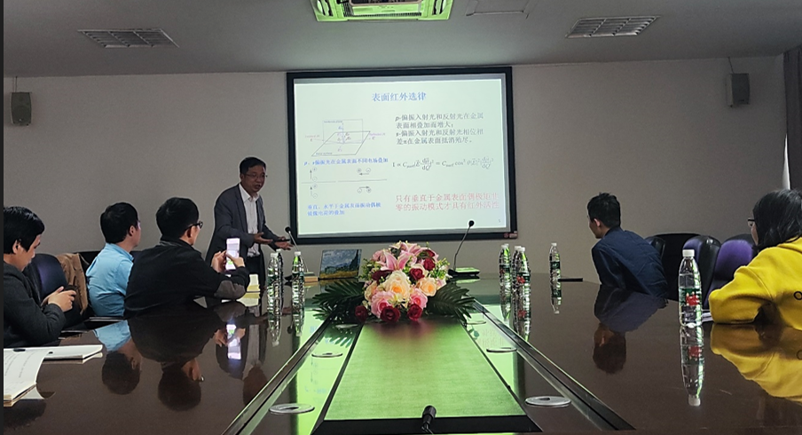报告结束后,蔡文斌老师还与老师和同学们探讨了关于表面增强原位红外光谱的实际应用,以及包覆材料可能对反应的影响。报告内容生动详实,互动频繁,在场师生对于表面增强的红外光谱的机理与应用又有了新的认识。