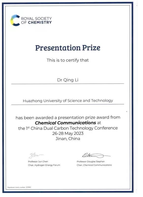 新能源材料与器件研究中心李箐教授在氢能分论坛作《高性能结构有序铂合金燃料电池阴极催化剂》的报告,获得英国皇家化学会Chemical Communications期刊优秀报告奖。