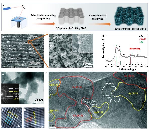 图1 3D打印/脱合金复合技术制备纳米多孔CuAg双金属及其结构表征