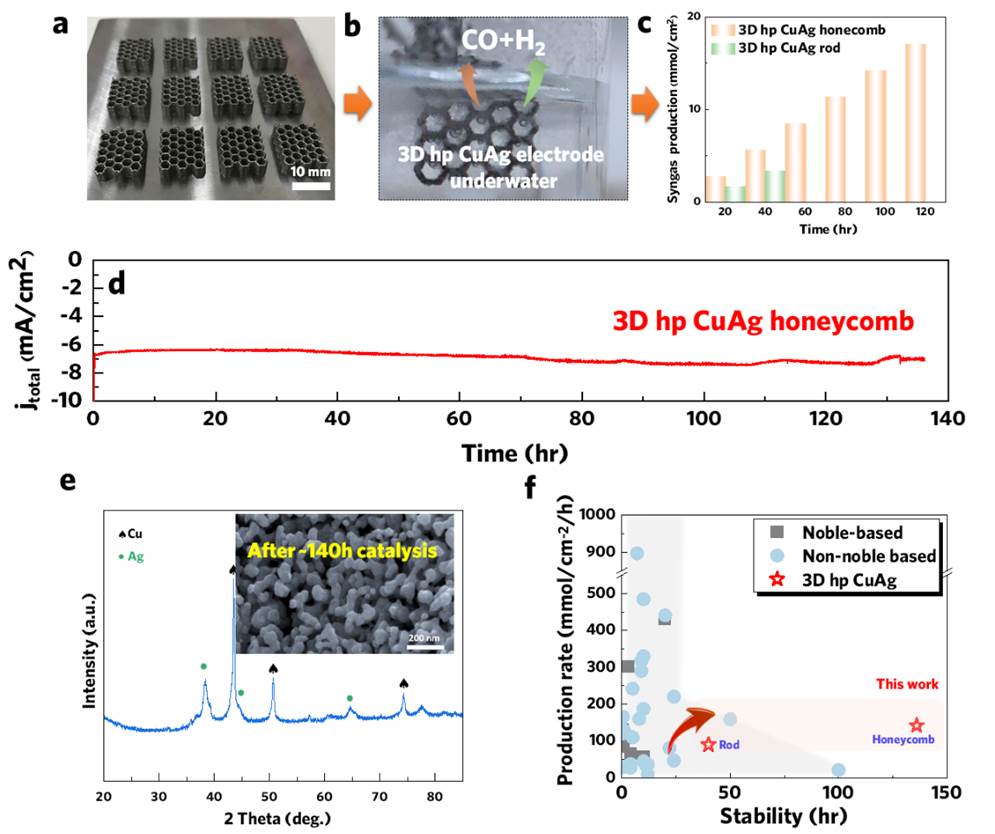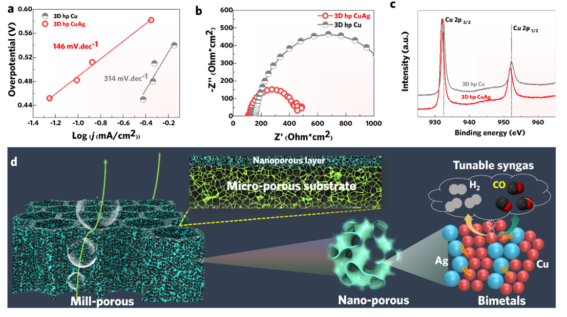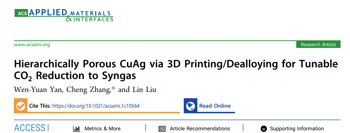 最近,新金属材料研究中心柳林教授团队张诚等人通过激光3D打印技术与电化学脱合金技术复合,成功制备了具有分级多孔结构的CuAg双金属,并系统研究了其电催化还原CO2生成合成气性能与机制。通过合理设计3D打印前驱体的合金成分,成功制备出3D分级多孔与纳米尺度相分离的CuAg双金属,实现了高的法拉第效率(>92%)以及宽的合成气可调比例(H2/CO从3:1到1:2)。进一步通过构筑分级孔结构,该3D分级多孔CuAg蜂窝催化剂的合成气产率进一步提高,达到140 μmol/cm2/h,超长的电化学稳定性140h(为目前合成气文献最高值)。此外,还发现3D分级多孔CuAg的催化性能显著优于3D分级多孔Cu以及2D分级多孔CuAg。研究发现:Ag的引入改变了Cu的能带结构,从而改善了反应动力学(Tafel斜率降低50%)并降低了电子转移电阻。而3D分级多孔CuAg的高稳定性与其跨尺度多孔结构有关,其中毫米孔促进了气泡的生长与解吸附,微米孔通过释放脱合金化中的应力使纳米多孔层与基体结合更稳定,纳米孔则极大地增加了催化剂的活性面积。本工作为开发高性能分级多孔电催化剂提供了新思路。