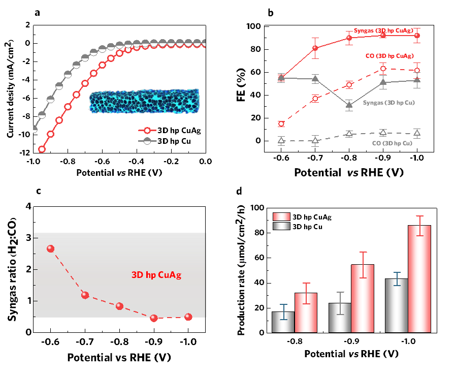 二氧化碳是造成全球变暖的主要原因之一,而电催化还原二氧化碳为碳捕获提供了一种新的技术手段。利用CO2还原与析氢反应(HER)反应耦合,可以产生具有高经济效益的合成气(H2+CO),从而为多种工业化学反应提供前驱体。然后,现有催化剂在调控合成气比例(H2/CO)、产率以及电化学稳定性方面仍有待进一步改善。例如,大多数研发的合成气电催化剂的稳定性低于24h,限制了其实际应用。