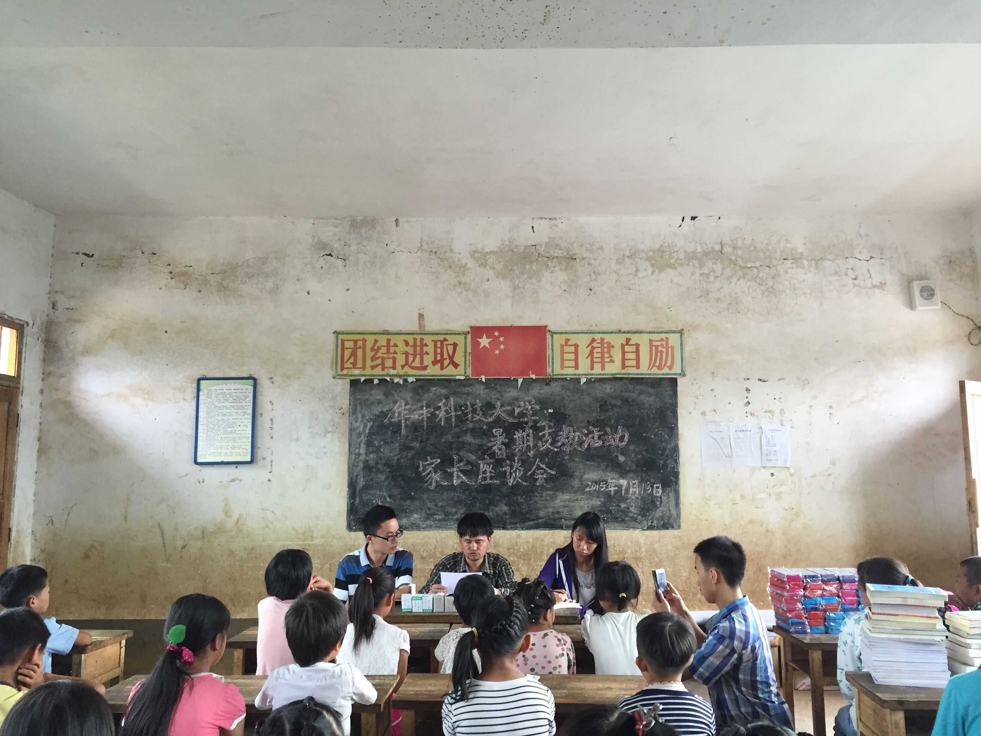 13日上午我们召开了参与支教课堂学习的学生家长座谈会,首先校长对我们的支教活动进行了简单介绍,然后是向每位学生捐赠我们准备的文具,最后是与每一位家长签定安全协议。通知家长到学校的时间是早上八点,但是家长和孩子们在七点半左右就基本上来齐了,父老乡亲们的信任和支持让我们深感欣慰,也越发明白自身责任的重大。对于山区孩子,教育也许是改变他们命运的最好办法,虽然会充满坎坷,也可能会出现有一些不公平,但是,拨开他们内心的阴霾,让他们感受到更多的阳光照耀,是我们应尽的责任,也是我们内心的期盼。下午校长又给我们讲了很多关于学校的情况,这里受到了很多来自国家和社会的补助和资助,比如国家的营养午餐计划、东莞千分之一基金会资助的学前班午餐计划,还有上海电视台和解放军理工大学每年定向资助20多名学生。晚上我们又对自己的教案进行了最后的整理,为第二天的开课做好充分的准备。