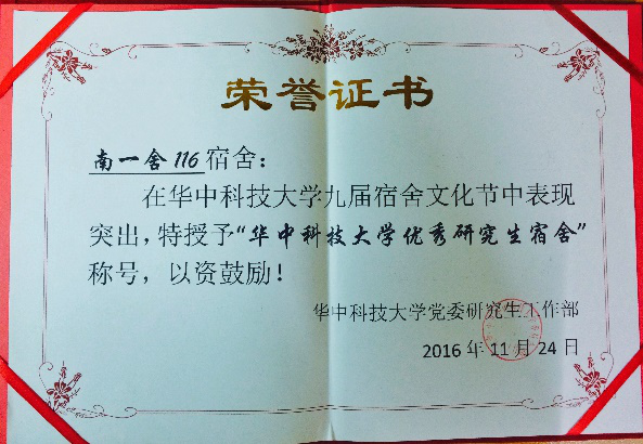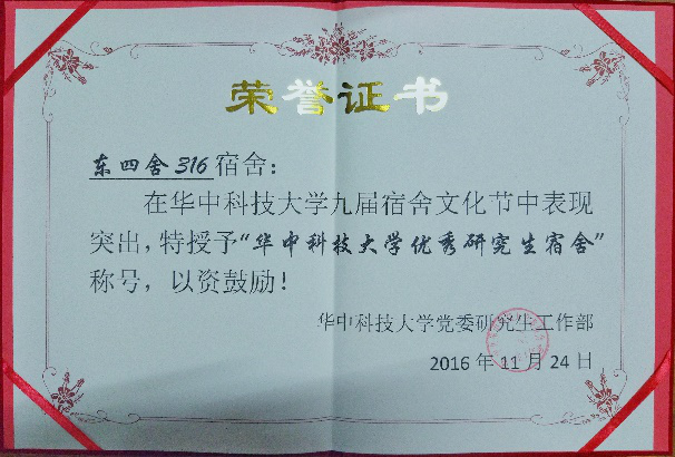 优秀学生宿舍”评选中,我院学生宿舍东四舍316和南一舍116获得优秀宿舍称号。东四舍的四位男生分别为16级材料加工的仇伟、张启宪和16级材料学的胡泉、潘然,他们制定了宿舍水果节和党员特色展等具有宿舍特色的集体活动,同时,宿舍成员在学习和文体活动上的获奖颇多。南一舍116的魔性论坛