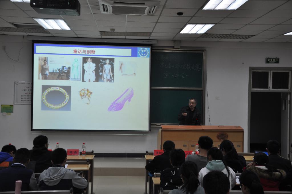 在简单的暖场环节后,王从军教授以球面拼图作为实例详细介绍了正向设计方法,用多种产品为例介绍了从实物到工艺规划的逆向设计方法,用自己的设计经历生动地介绍正向逆向混合设计思路。而后,王从军教授简单介绍了几种数字化测量技术与设备,细致地讲解了粉末激光快速成型的过程、特点,以及3D打印的前景并附以精美的成果展示。最后王从军教授提出对同学们的期望与祝愿并鼓励参赛同学勇于拼搏,大胆创新。