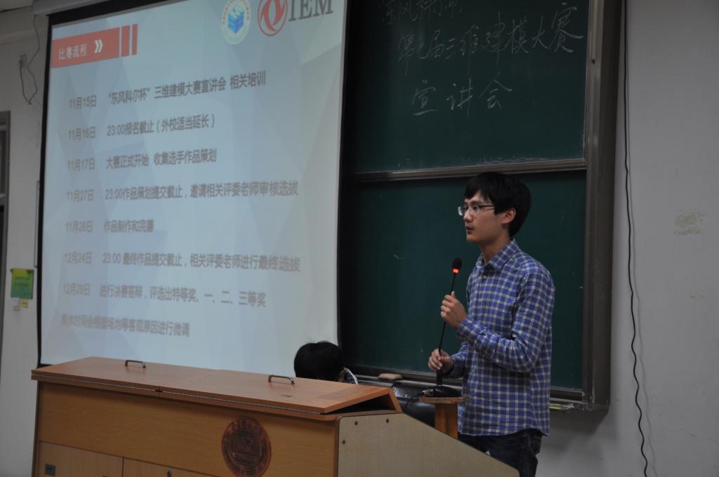 科协主席杜超杰同学上台回顾了过去几年里三维建模大赛的创新历程并详细介绍了本届大赛的主题和流程。杜超杰同学紧接着对作品策划要求、评分规则和报名方式做了简单的介绍,并向所有参赛同学致以真诚的祝福。