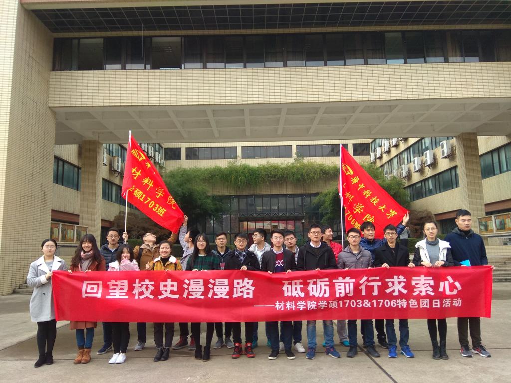 材硕1703和材硕1706党支部在2018年4月1日举办了联合特色党日活动。活动分为两个部分:校史馆参观和图书馆活动。通过校史馆的参观游览活动,领会华科一路成长索秉承的精神内涵,牢记一身为一名华科人的所需要的精神品质,牢记身为一名中国青年的历史使命,在大踏步进入全面建成小康社会的新时期,发展我们青年人的力量,高举旗帜,用崭新的面貌走向未来。