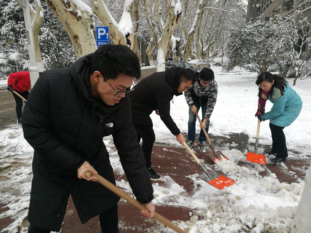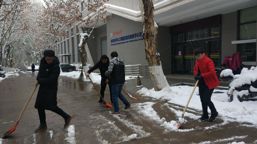 在大家的共同努力下,整个除雪活动进行的非常顺利,不到两个小时,除雪队伍分别将先进制造大楼西楼南门和北门的通路以及西楼正门道路的积雪和冻冰清理干净,随后来到魔性论坛
