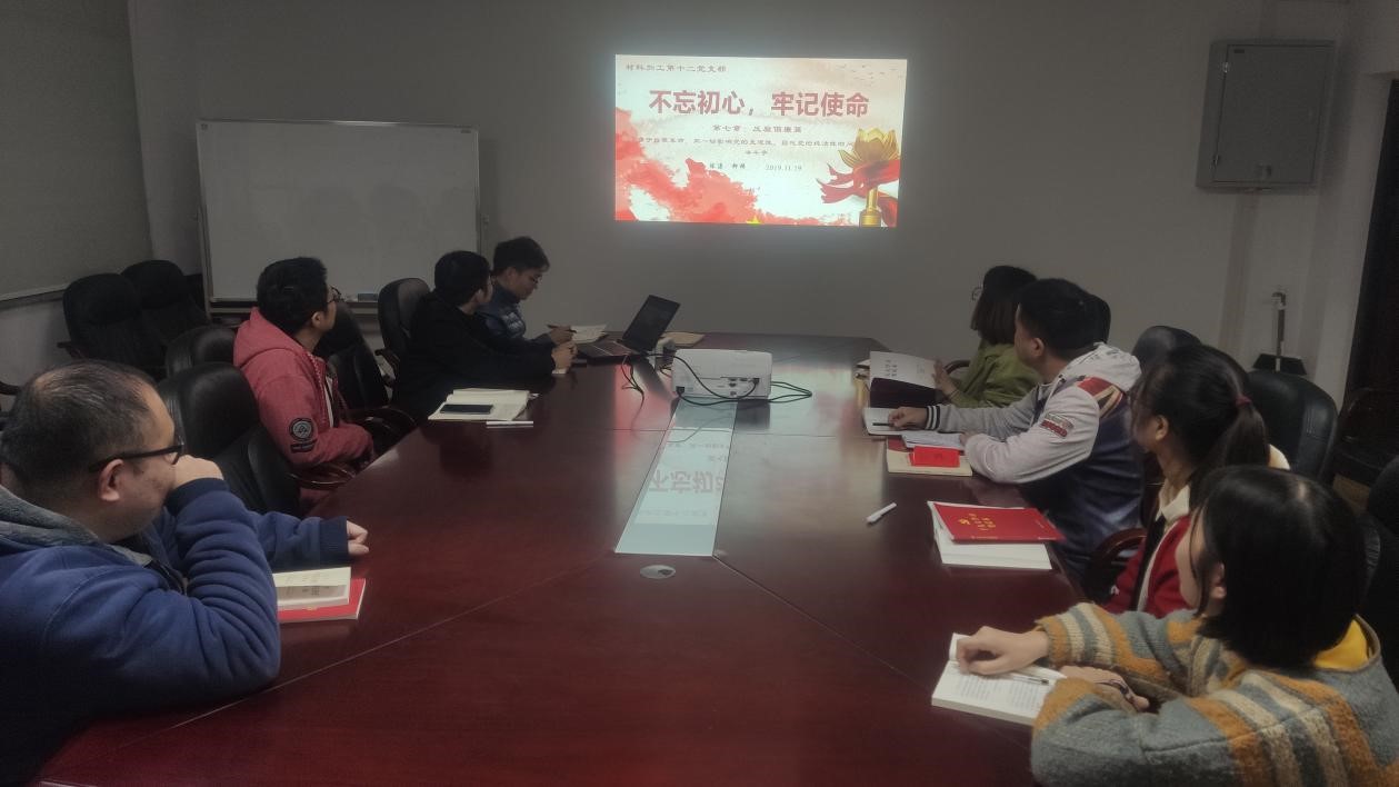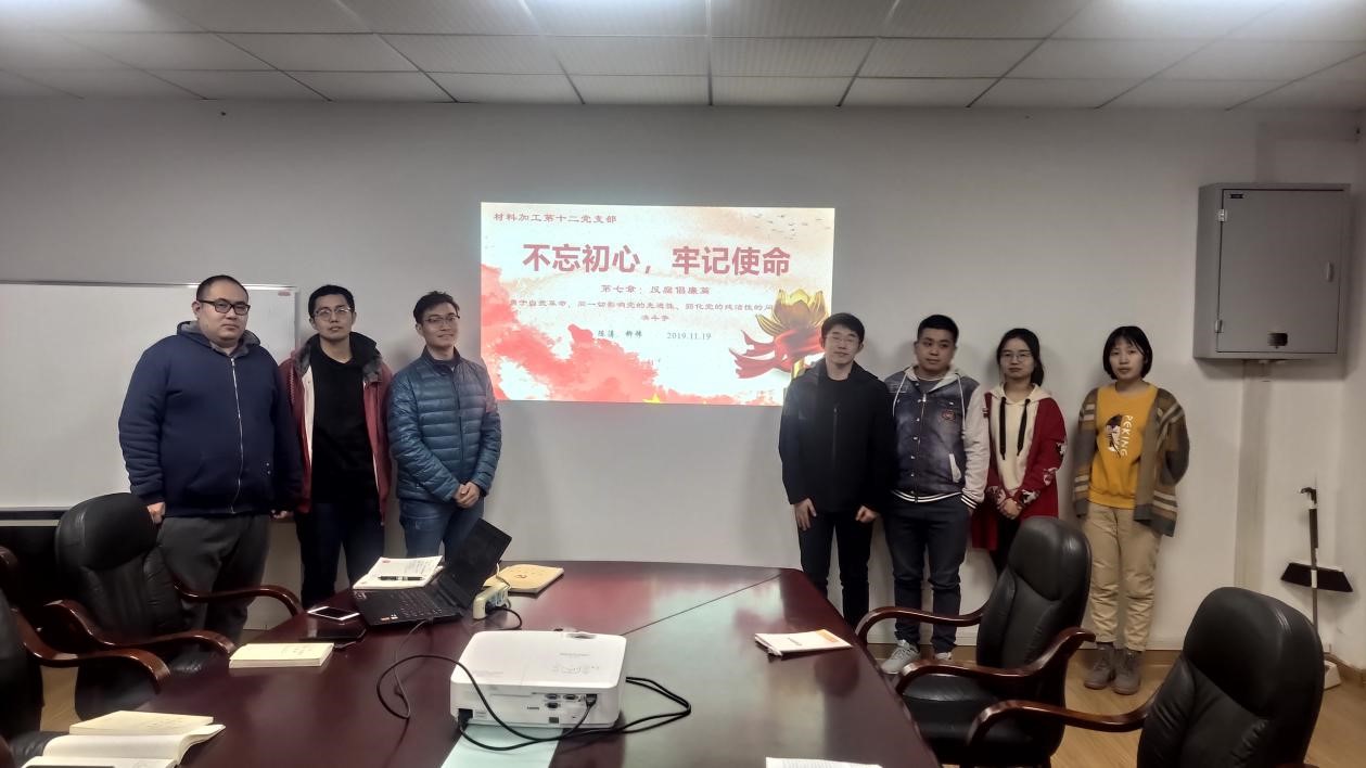 材料加工第十二党支部在东八楼二楼会议室召开党支部组织生活会,本次生活会主题以“不忘初心、牢记使命--第七章:反腐倡廉篇”为主题,会议由党支书、2016级博士李建宇主持,全体党员和入党积极分子参加会议。