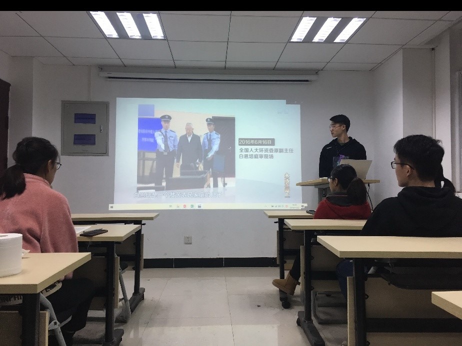 会议初始,新生党员叶港同志讲解道:习近平总书记在十九大报告中指出,在全党开展“不忘初心、牢记使命”主题教育,用党的创新理论武装头脑,推动全党更加自觉地为实现新时代党的历史使命不懈奋斗。在学院党委的支持下,去年研究生党支部向课题组党支部改制。各支部要从保持党员的纯洁性和党支部的先进性入手,强化理论学习,增强为人民服务的意识,建立健全和规范三会一课制度,把各项工作落到实处。他在第二章节讲到,我们要保持党员的先进性和纯洁性,经受“四大考验”、克服“四种危险”,确保党始终成为中国特色社会主义事业的坚强领导核心。领导干部要以身作则,党员同志要自我革新。并观看了“河南省安阳市中级人民法院公开宣判全国人大环境与资源保护委员会原副主任委员白恩培受贿、巨额财产来源不明案”纪录片,指出我们要强力反腐,对腐败采取零容忍的态度。