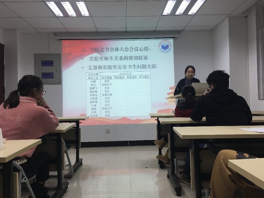 刚开展的全体党支书大会的心得体会,提出我们要保持实验室师生关系的密切联系,支部党员要起到先锋模范带头作用,积极主动负责实验室安全卫生问题,发挥身先士卒、为人民服务的精神。叶添同志在会议期间说到,强化组织监督和民主监督,发挥同级相互监督作用,可落实到我们实验室的安全卫生问题,只有大家相互监督,实验室的安全卫生才会更好! 最后刘媛同志通知全体党员交纳十一月党费,刚加入支部的新生党员补交7月至9月的党费,并按时交学习笔记。