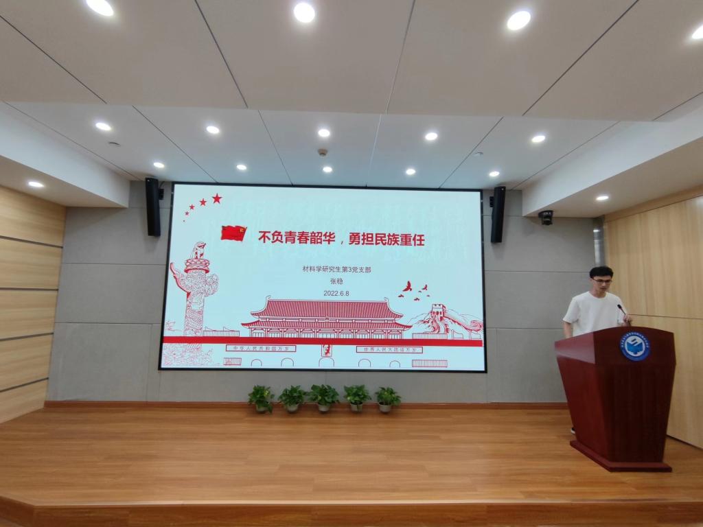 材料学第三党支部支书张稳同志以《不负青春韶华 勇担民族重任》分享了5月份特色主题党日活动。活动包含三项内容,一是有理论学习之学习2022年两会精神,二是热烈讨论之微型辩论赛新时代构建世界一流大学之学生的主要任务,三是毕业说之支部毕业党员寄语。