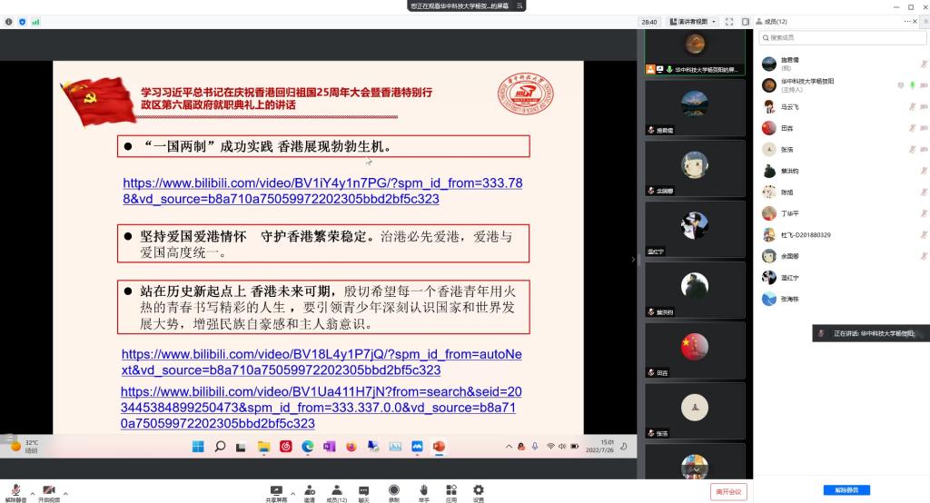 各研究生党支部围绕着习近平总书记在庆祝香港回归祖国25周年大会暨香港特别行政区第六届政府就职典礼上的讲话、习近平总书记在湖北武汉考察的重要讲话精神、中国共产党湖北省第十二次代表大会上的报告等三方面展开学习,党员们从百年党史中感悟党的百年奋斗历程,树立鸿鹄之志,坚定理想信念,践行初心使命。