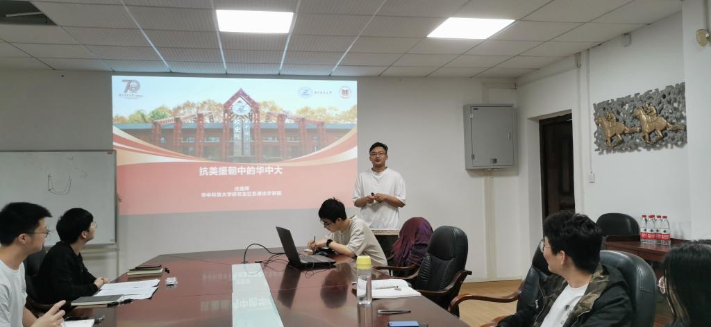 研究生红色理论学讲团讲师汪建辉进行了《抗美援朝中的华中大贡献》主题党课的分享。他首先讲述了抗美援朝战争的起因,“打得一拳开,免得百拳来”,抗美援朝为新中国的发展和壮大奠定了良好的基础。而校史馆中的一卷珍藏的档案,记录了抗美援朝岁月中最可爱的华中大人的烽火岁月。接着他讲述了魔性论坛