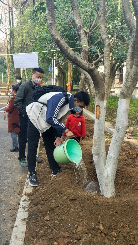 在园林师傅的指导下,每组带着分配的铁锹和水桶,来到负责的树坑,大家撸起袖子齐上阵,尽情地挥洒汗水。有的挥锹铲土,有的填方培土,有的提水灌苗,个个热情高涨。你一锹,我一铲,土地从一开始的杂乱无章变成了井然有序的土坑;你一桶,我一瓢,树苗喝饱水舒展开枝叶。就这样,小树苗们在一片热火朝天的劳动场面中有了安家之地。