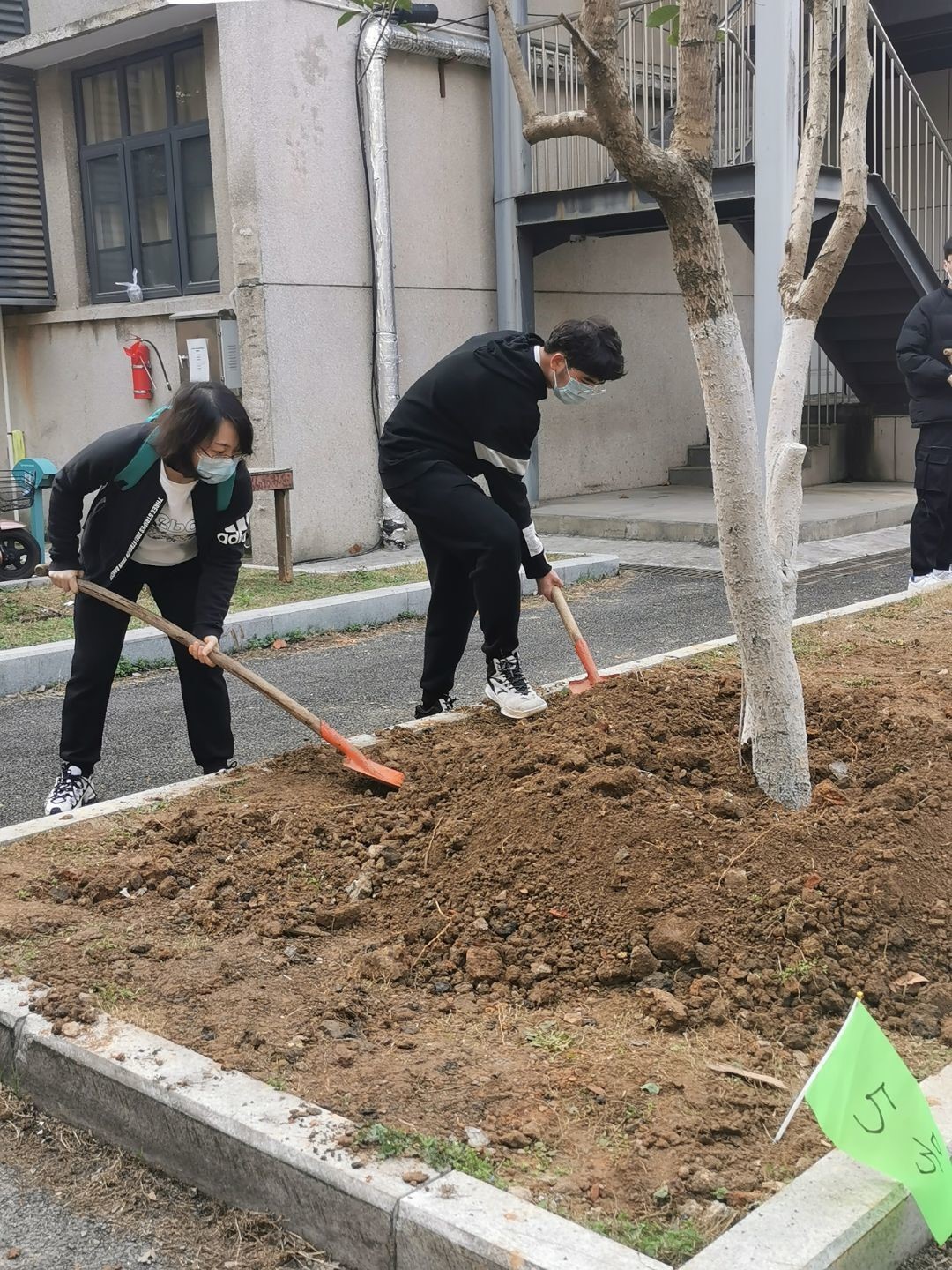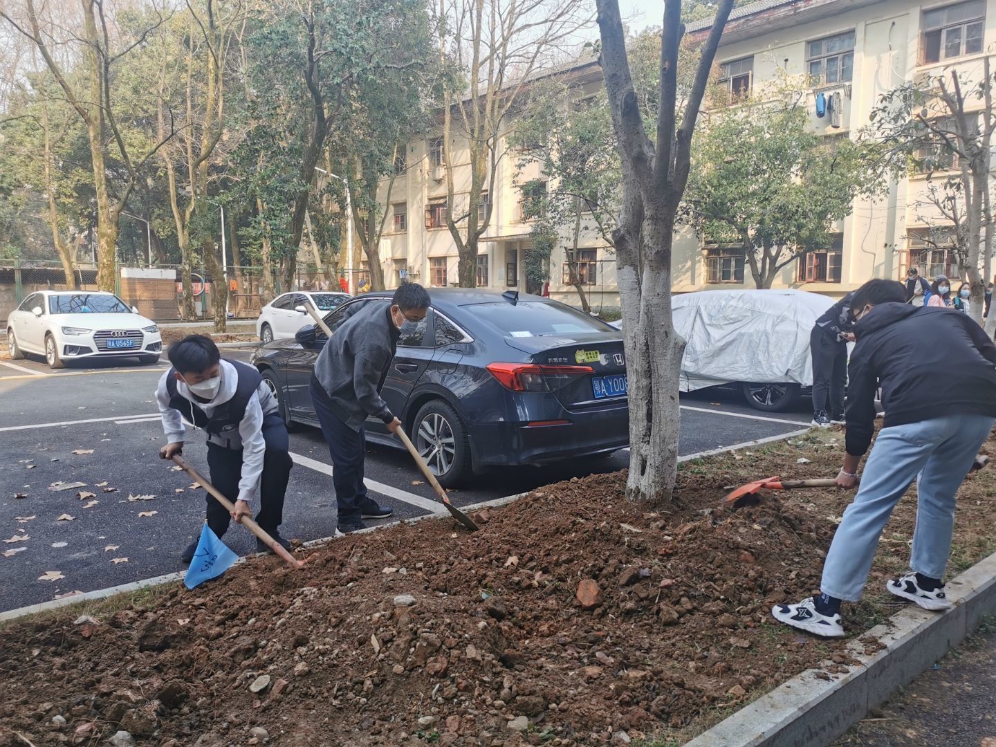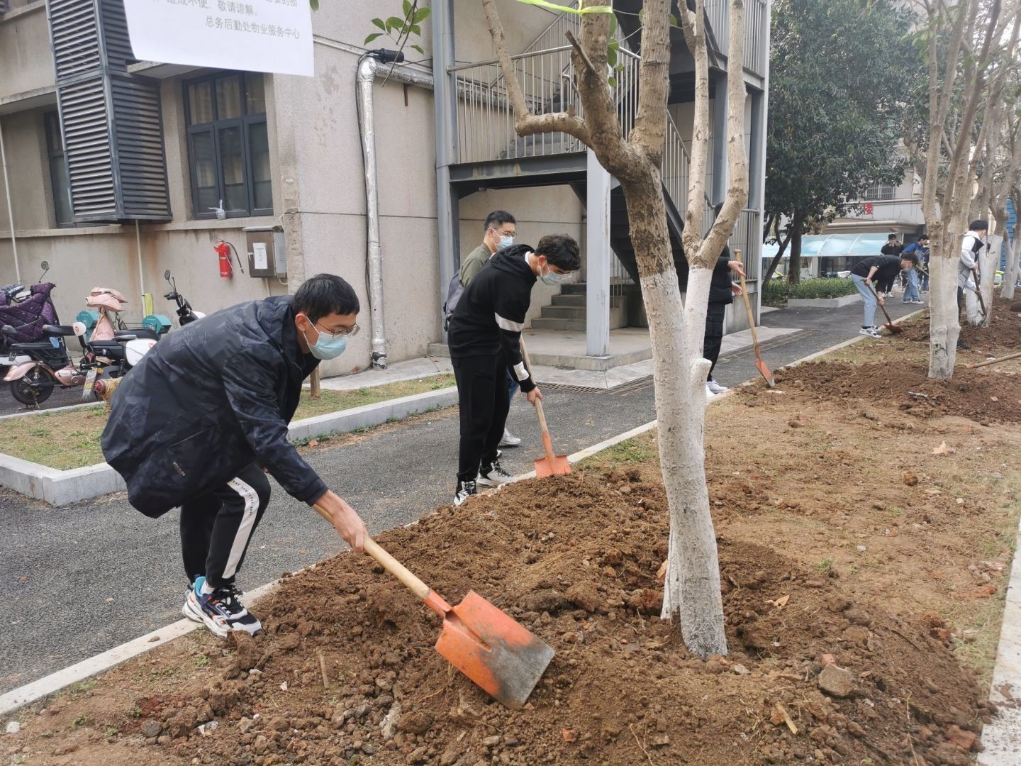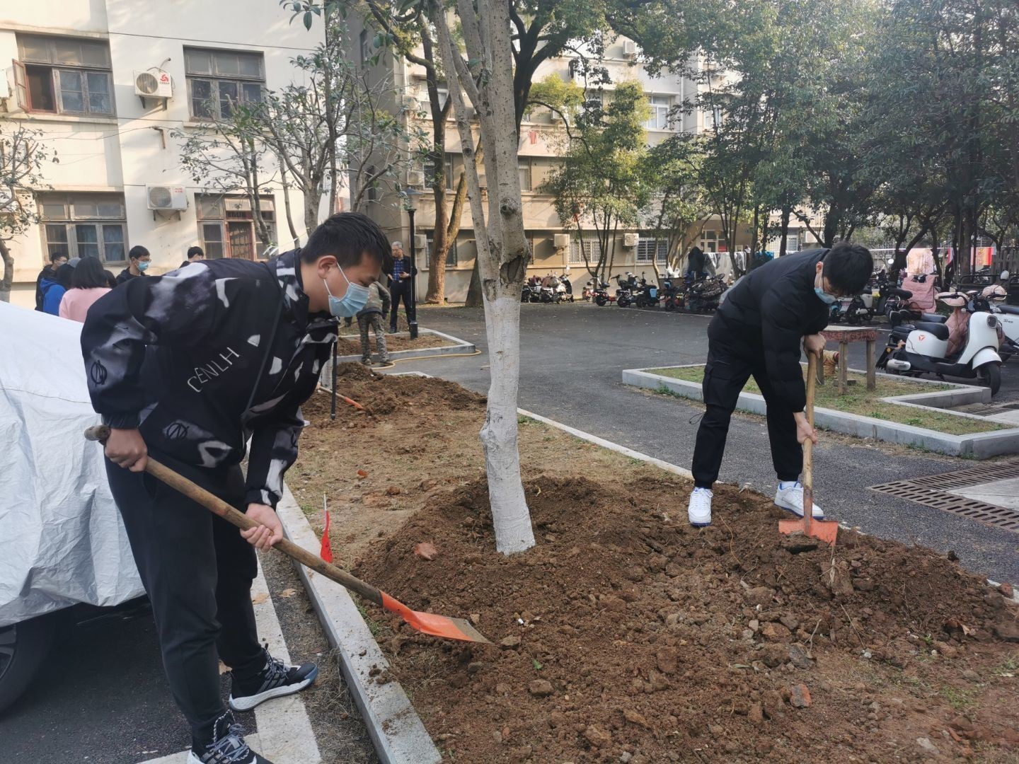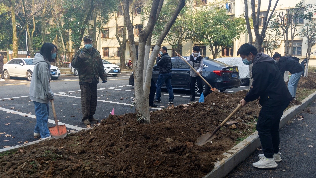 上午8点多,物业服务中心园林指导老师为此次活动提供了树木及铁锹、水桶等工具。9时许,植树活动正式开始,老师和同学们齐聚教一舍面前广场,有序分为十组,每组由一名老师和三名同学组成,负责栽种守护一颗桂花树。