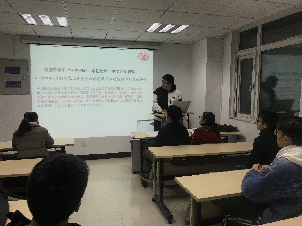 会议初始,新生党员文晓琨同志为大家讲解:中国特色社会主义进入新时代,我们比历史上任何时期都更接近、更有信心和能力实现中华民族伟大复兴。我们千万不能在一片喝彩声、赞扬声中丧失革命精神和斗志,逐渐陷入安于现状、不思进取、贪图享乐的状态,而是要牢记船到中流浪更急、人到半山路更陡,把不忘初心、牢记使命作为加强党的建设的永恒课题,作为全体党员、干部的终身课题。并分析了纷繁动荡的国际局势,以中美贸易战、香港暴乱、中国新疆,反恐前沿为例。