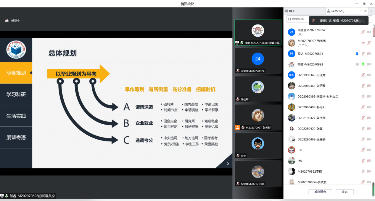 郁睿学姐从“明确规划、学习科研、生活实践、朋辈寄语”四个方面展开自己的分享。以毕业规划为导向,提早找准自己的未来方向,早做准备早做行动,针对大多处于研一上学期的同学们,学姐以时间轴的形式为大家讲解了研究生三年的最重要的一些时间节点,让大家对未来学习科研与工作的规划有一个初步的时间上的认识,帮助同学们构建未来整体规划框架。学习科研上,学姐为大家简单分享了一些自己的认识与感悟,不论未来自己的方向如何,做为一名研究生,该有的科研态度还是必须具备的,提早熟悉科研环境、掌握基本的实验技能要从现在做起。最后,学姐也为大家提出几点建议,科研之路是枯燥的,但生活是自己的,以积极乐观的心态对待,在课外之余参加一些志愿活动,在实际行动中贡献的自己的社会价值,又何尝不是一种生活。