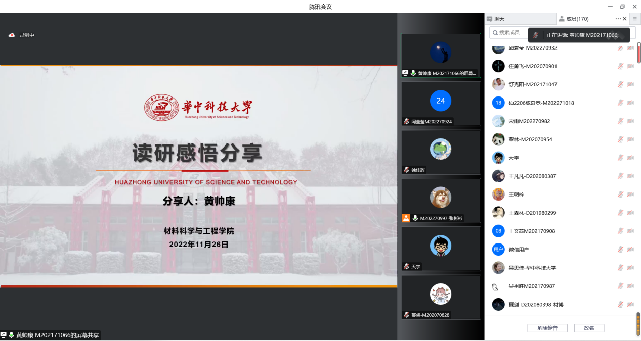 研究生会学术中心邀请了2022年国奖获得者做客“优博沙龙”,结合自己的科研经历进行学术经验分享。为积极配合学校疫情防控政策,本次“优博沙龙”于2022年11月26日晚19:00,在腾讯会议开展。本次会议由学院研究生会学术部成员张彬彬主持,活动面向魔性论坛
