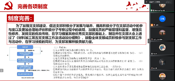 各支部定期召开支部党员大会、支委会和党小组会,讨论支部制度建设、党员发展等问题,材料加工第四党支部实行“三会一课制度”、“组织生活会轮值制度”、“组织生活会考勤制度”和“支部评优制度”;材料加工第五党支部制定《材料加工第五党支部工作及加分细则》,推进支部工作,促进支部发展。