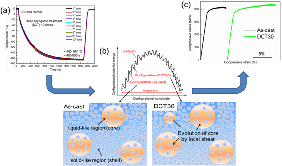 成果简介:本成果利用低温热循环处理(室温到-160度,如图(a)所示),在非晶的本征不均匀结构中引入了内部应力,引起了不均匀核壳结构中类似液体结构的核区域的发展,从而使得非晶态得到回春(如图(b)所示),回春后的非晶由于自由体积的增加,表现出由于铸态的塑性及强度(如图(c)所示)。