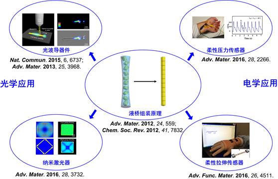 研究特色:揭示了“液桥诱导自组装原理”(如图1中间所示),将这一原理用于不同结构/化学组成的微/纳米单元的一维有序组装。将一维规则有序结构用于构筑光学,如光波导、激光器(如图1左边)和电学,如柔性压力、拉伸传感器(如图1右边)等新型光电子器件。