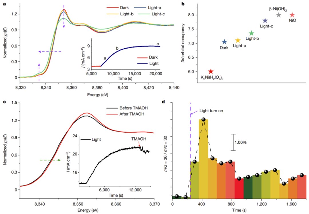通过原位同步辐射吸收谱,研究人员发现当处于光照时,NR-NiOOH中镍的价态逐渐降低,如图3a和b所示。这表明在光照的情况下,金属作为催化反应的氧化还原中心。通过对光照时镍电子态,配位数及键长的进一步分析,研究者发现镍的价态降低是由光触发的八面体向平面四面体相变所导致。于此同时,研究人员发现当发生八面体向平面四面体相变时,会产生非成键的氧,这表明当处于在光照时,氧也可能会作为催化反应的氧化还原中心。为了验证这一推测,研究人员进行了TMA分子探针及18O同位素测试,结果表明在处于光照时,氧也作为催化反应的氧化还原中心。