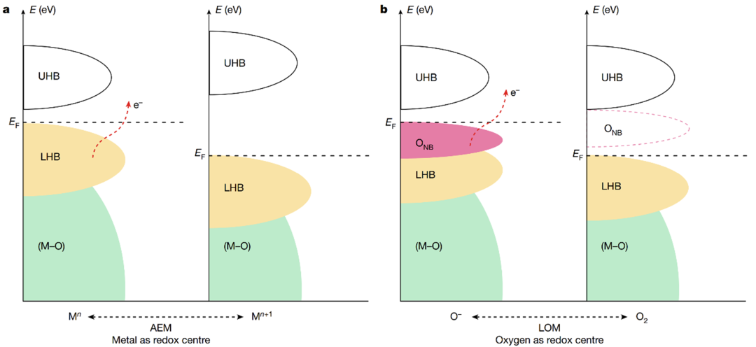 ▲图1:现有的两种OER催化机制。(a)费米能级附近电子态表现金属特性时,金属作为氧化还原中心的吸附机理(Adsorbate evolution mechanism, AEM);(b)费米能级附近电子态表现为氧时,氧作为氧化还原中心的晶格氧机理(Lattice oxygen oxidation mechanism, LOM)。(图源:Nature)