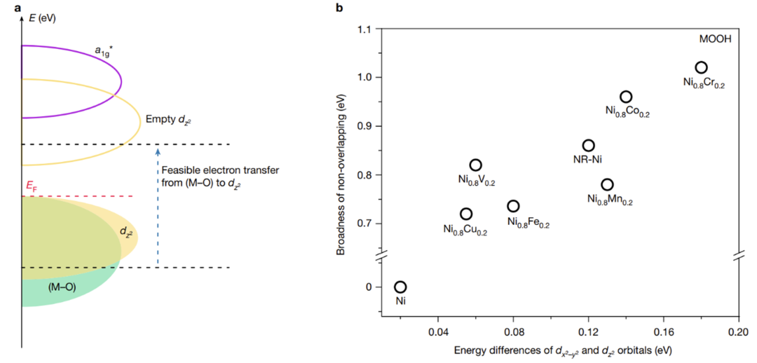 接下来,研究人员对光激发的氧能带到金属dz2轨道的电子传输进行了深入的研究,结果表明该类型电子传输与晶体结构畸变密切有关。当晶体结构畸变程度比较低时,例如NiOOH,其未占据的dz2轨道与a1g*轨道完全重合。由于a1g*能带是由金属4s与O 2p轨道杂化形成的,根据Ni原子轨道填充顺序,不能实现氧能带到金属dz2轨道电子传输。这也解释了为什么在光照时NiOOH没有任何光相应。而当晶体结构畸变程度比较高时,例如NR-NiOOH, NiFeOOH等掺杂体系,未占据的dz2轨道与a1g*轨道存在未重合区域,因此可以实现氧能带到金属dz2轨道电子传输,如图5所示。