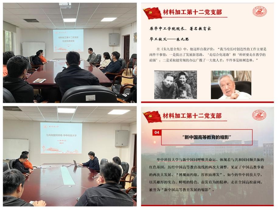 国防材料研究生党支部于4月14日在东八楼开展校史学习。秦建同学分享了朱九思老校长的事迹,阐述了在当时特殊的历史环境下力留人才的故事,朱九思老先生惜才爱才、育德育人,正是因为他的“谋”与“敢”,才让原华中工学院快速发展,迎头赶超。接着夏永中同学就学校的合并史进行了分享,历经中国高等教育战线的两次大调整,见证中国高教事业的两次大发展,“博观而约取,厚积而薄发”,如今的魔性论坛