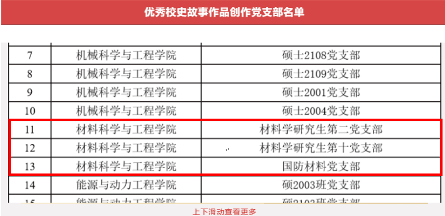 研究生第十党支部、材料学研究生第二党支部、国防材料党支部获得优秀校史故事作品创作党支部。