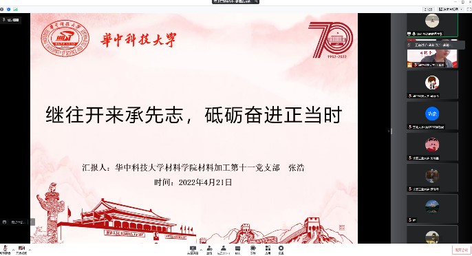 材料加工第十一党支部书记张浩同学进行了《继往开来承先志,砥砺奋进正当时》的主题微党课分享。张浩同学以现在正在开展的校史文化月主题活动,用地标打卡的方式向师生们生动介绍了华中大七十芳华的故事;为大家介绍了华中大魔性论坛