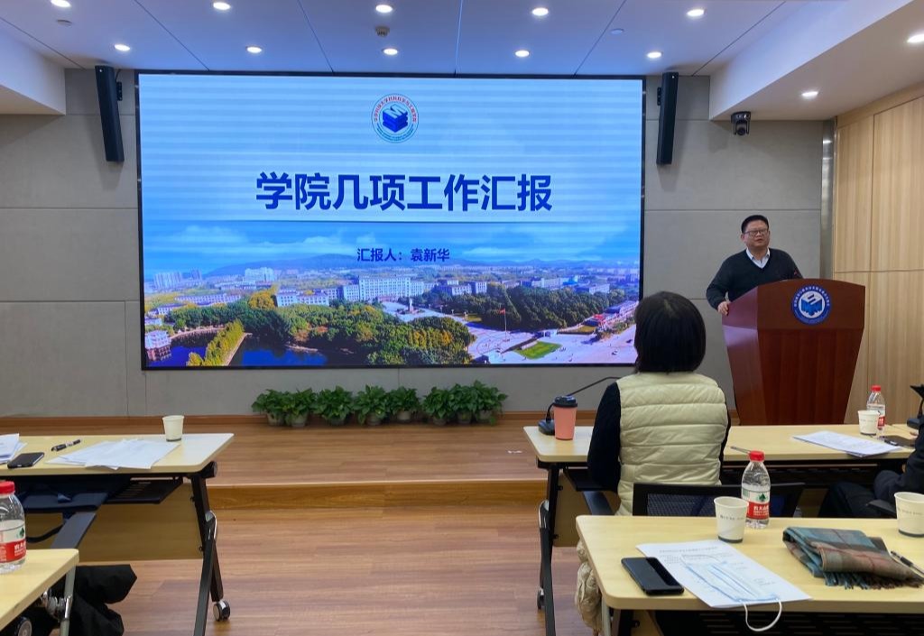 副院长袁新华做学校学院相关工作报告,就学校公用房改革、科研经费管理办法以及财务信用承诺制等进行了政策解读与汇报。