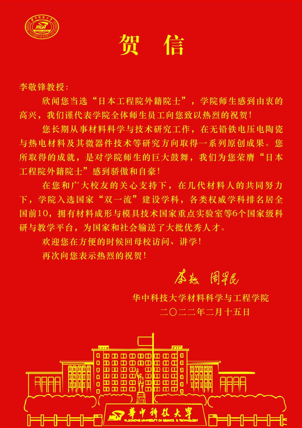 党委书记李毅、院长周华民代表我院师生向李敬锋教授致信表示祝贺。