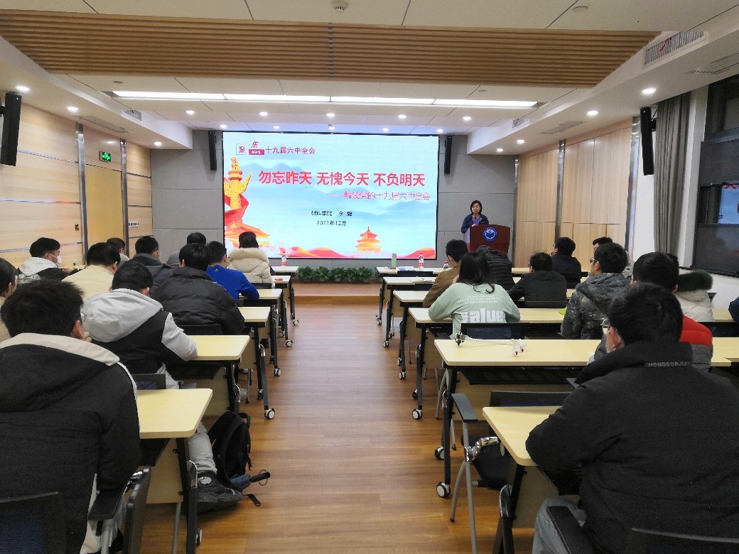 党委书记李毅以“勿忘昨天,无愧今天,不负明天——解读党的十九届六中全会”为题,作了一次党的十九届六中全会精神报告会。学院党委副书记蒋文海主持报告会,全体辅导员、学生党支部书记共计40余人参加了报告会。