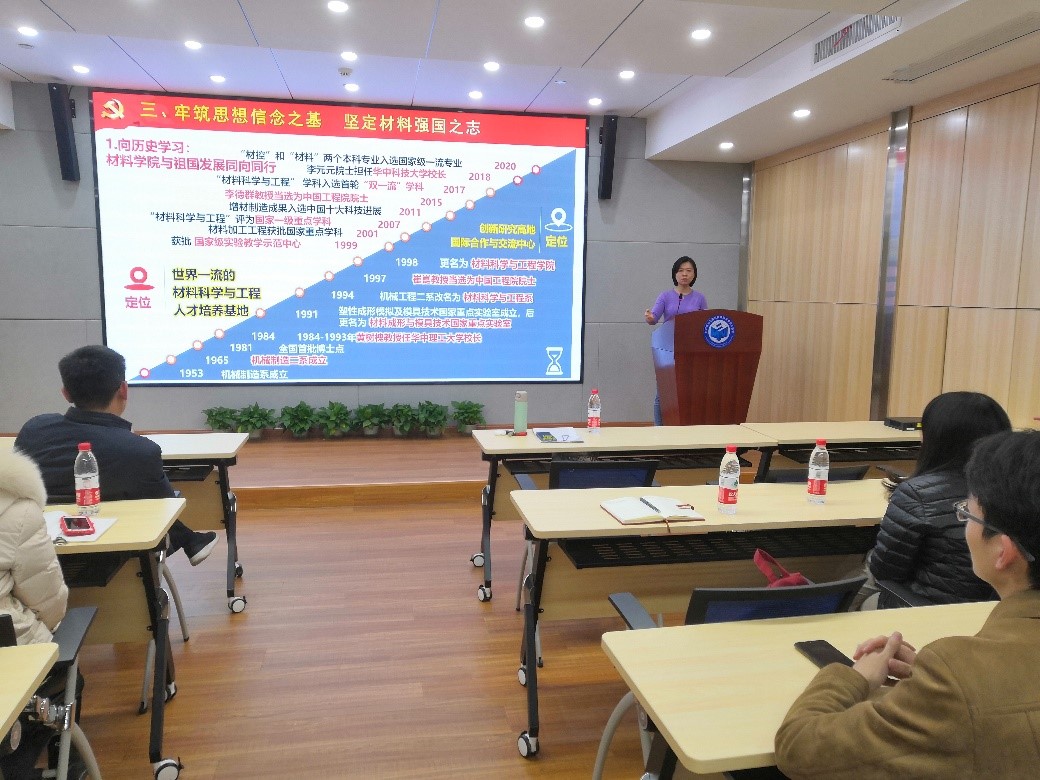 的发展情况,引导同学们向历史学习、向师长学习、向朋辈学习、向校友学习,牢筑理想信念之基,坚定材料强国之志。对此,李毅寄语同学们:一是要牢记党员使命,坚定理想信念,加强党史学习,做到内化于心外化于行;二是要担当时代重任,练就过硬本领,努力掌握科学文化知识和专业技能,以奋斗者的姿态投身到学习科研中;三是要锤炼品德修为,自觉树立和践行社会主义核心价值观,提升道德修为;四是要投身强国伟业,材料学子要与祖国一同攻坚克难,以“强国有我”的必胜信心,在新时代新征程上展现新作为新担当。