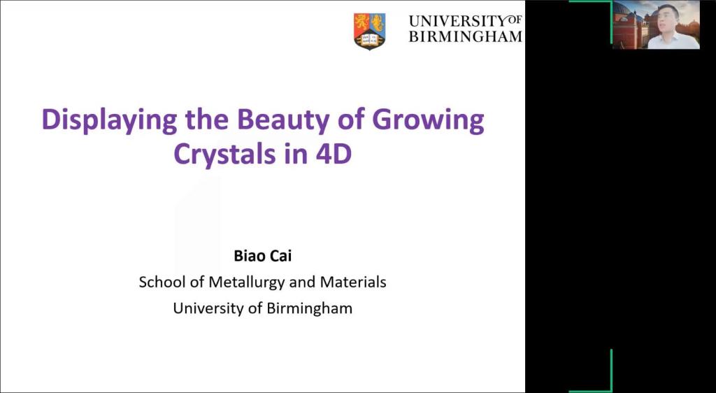 Biao Cai老师团队的研究方向主要是利用同步辐射X射线断层成像技术与中子源装置,从事物理冶金研究,如铸造、变形机制、辐照缺陷、增材制造等。在讲座中,老师从理论知识出发,以生动形象的图片和细致入微的讲解带领全体同学一起探索4维尺度之下晶体的生长之美,重点介绍了合金凝固到岩浆流动等各种现象。
