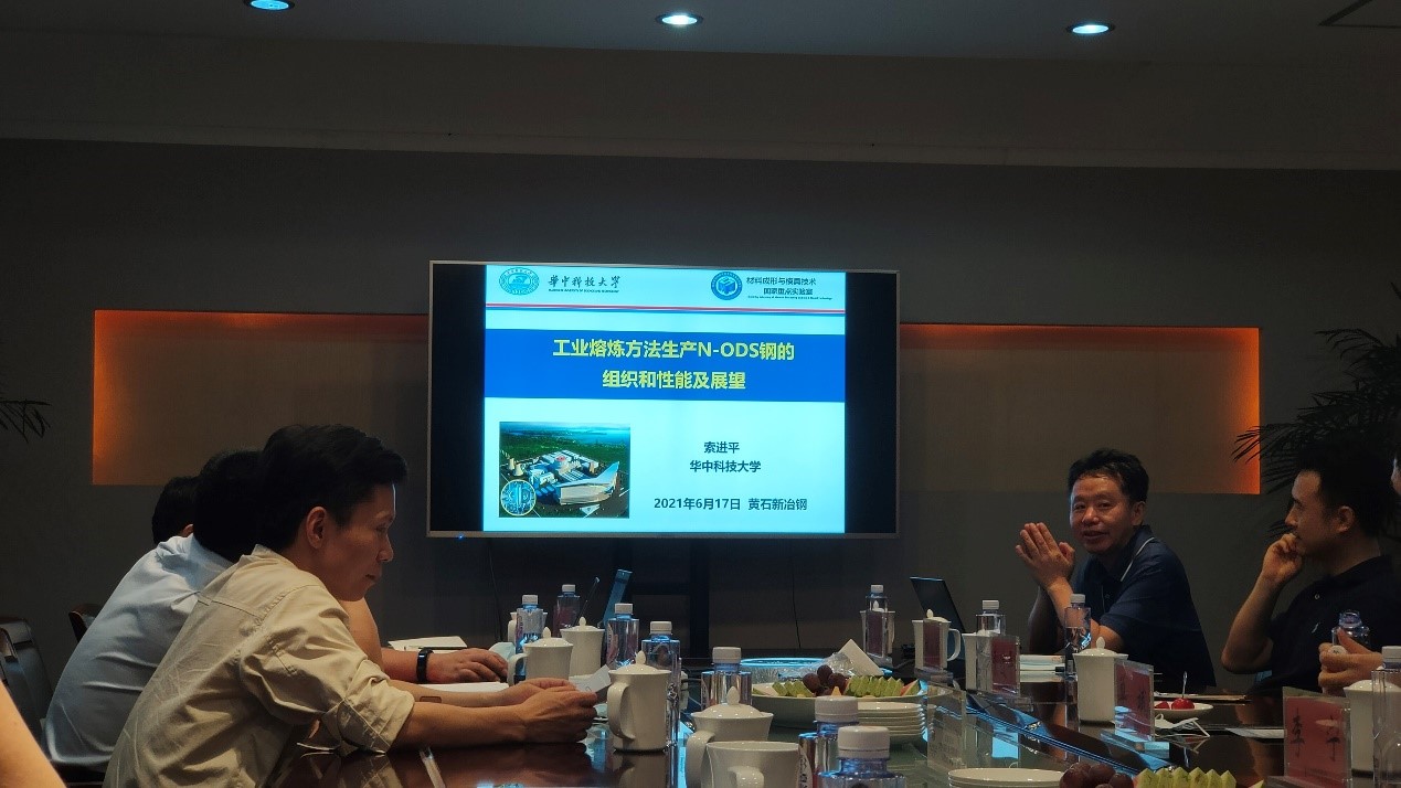 参观结束后,大冶特钢的总工程师周立新、研究分院院长刘光辉、研究分院副院长张志成等与新金属中心教师代表进行了技术交流。单斌主任就新金属中心的整体组织构架进行了介绍,索进平教授、胡树兵教授、潘杰教授和姚永刚教授分别作了特种钢材、金属涂层、梯度涂层和高熵合金为主题的专题报告。双方针对新钢铁材料的开发、工模具寿命的提高、三废处理有关的环境技术等方面进行了热烈探讨,达成了诸多共识。