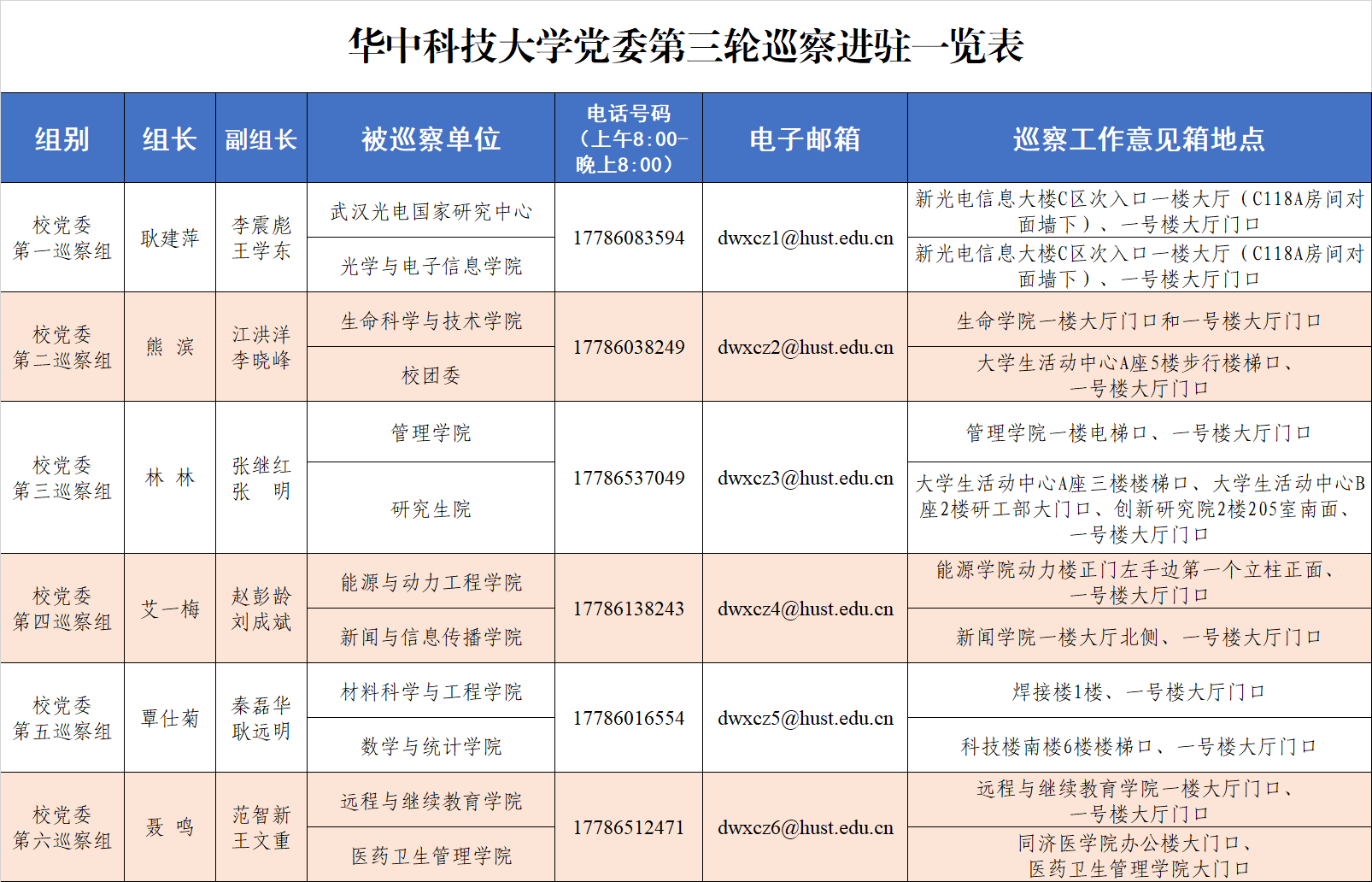 校党委第三轮巡察的单位为:武汉光电国家研究中心党委、光学与电子信息学院党委、生命科学与技术学院党委、管理学院党委、能源与动力工程学院党委、新闻与信息传播学院党委、 魔性论坛