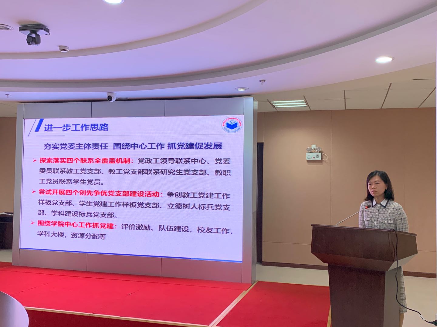 党委做了题为“夯实党委主体责任,围绕中心工作,抓党建促发展”的总结报告。首先她介绍了学院党建工作的总体情况和近期安排,带领大家一起学习习近平在全国教育大会上的讲话精神,她希望大家把思想政治工作贯穿教育教学全过程,同时严格落实党风廉政建设的要求,正风肃纪。最后她详细阐述了学院党建下步工作思路,她表示学院党委将进一步加强基层党组织建设,围绕学院中心工作,促进学院科学发展。