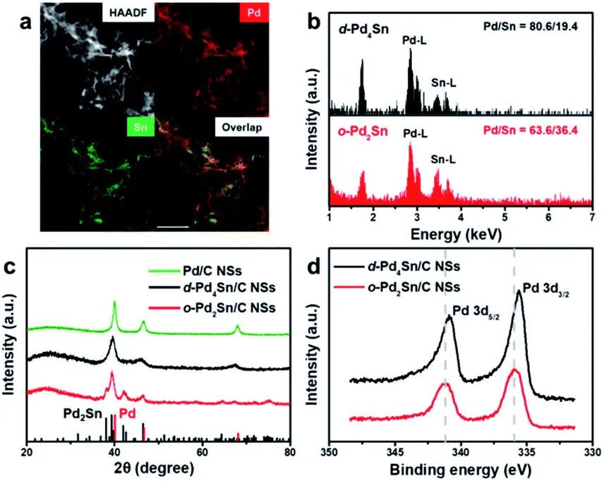图 3.(a-b)Pd2Sn 纳米片的元素分布以及比例,(c)Pd2Sn 纳米片的XRD 图谱,(d)Pd2Sn 纳米片的XPS 图谱。