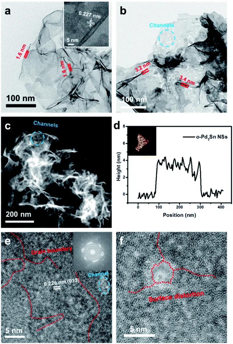 图 2.(a)Pd 纳米片的TEM图(b)Pd2Sn 纳米片的TEM图(c) Pd2Sn 纳米片的HAADF-STEM 图,(d)Pd2Sn纳米片的AFM 图(e-f)Pd2Sn纳米片的HRTEM 图。