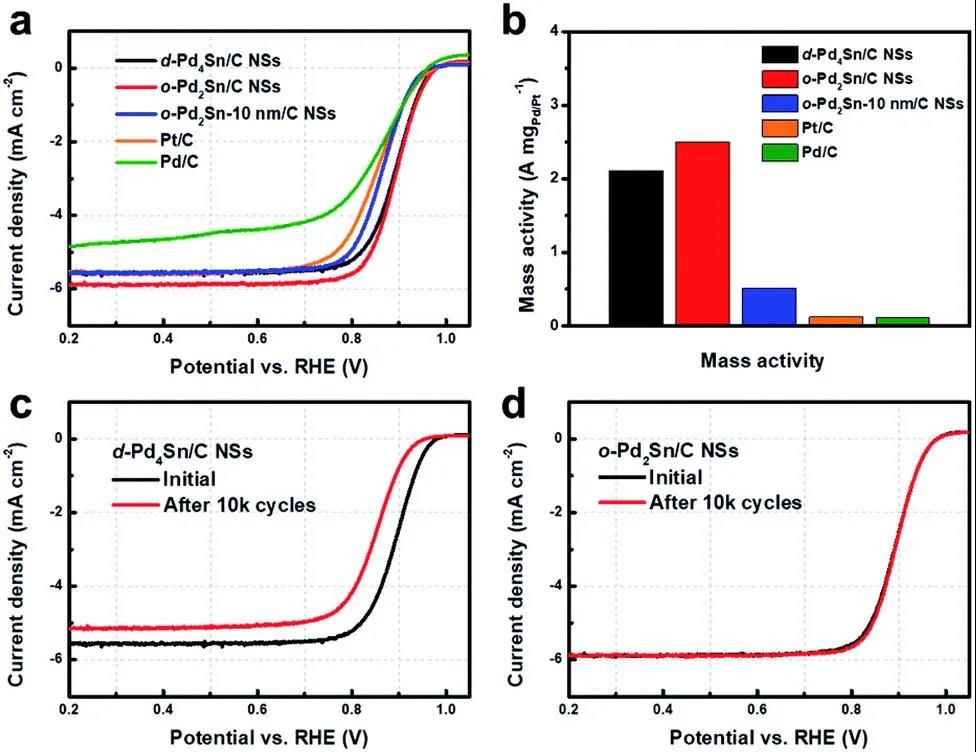 由于Pd2Sn 纳米片具有独特的二维纳米结构、富缺陷结构、以及 Sn 对 Pd 电子结构的调控能力,在 0.1 M KOH 中,Pd2Sn 纳米片表现出优异的催化阴极氧还原反应(ORR)活性。另外,Pd2Sn 纳米片还具有有序的原子排布,这能够提高 Pd-Sn 之间的相互作用,稳定晶体内部的 Sn,该有序结构以及二维纳米结构协同提高了催化剂的稳定性。