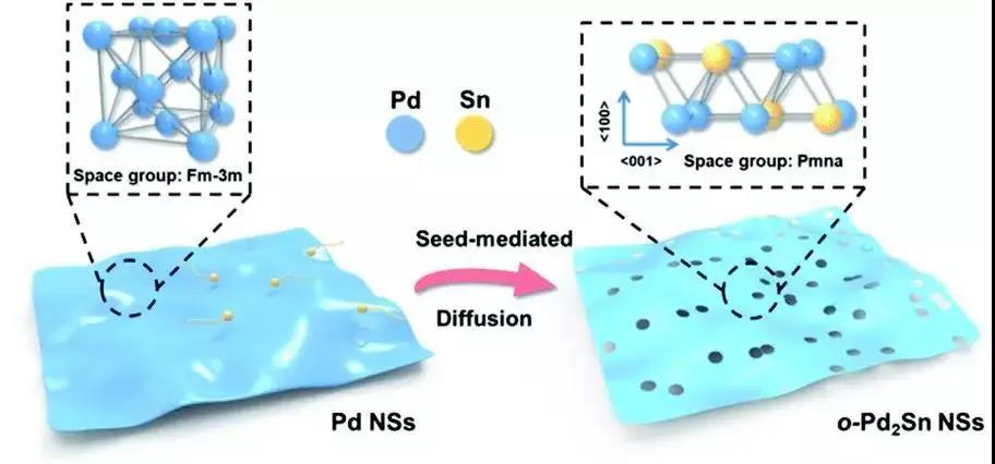 图 1. 使用“种子介导法”制备结构有序的二维 Pd2Sn 纳米片示意图