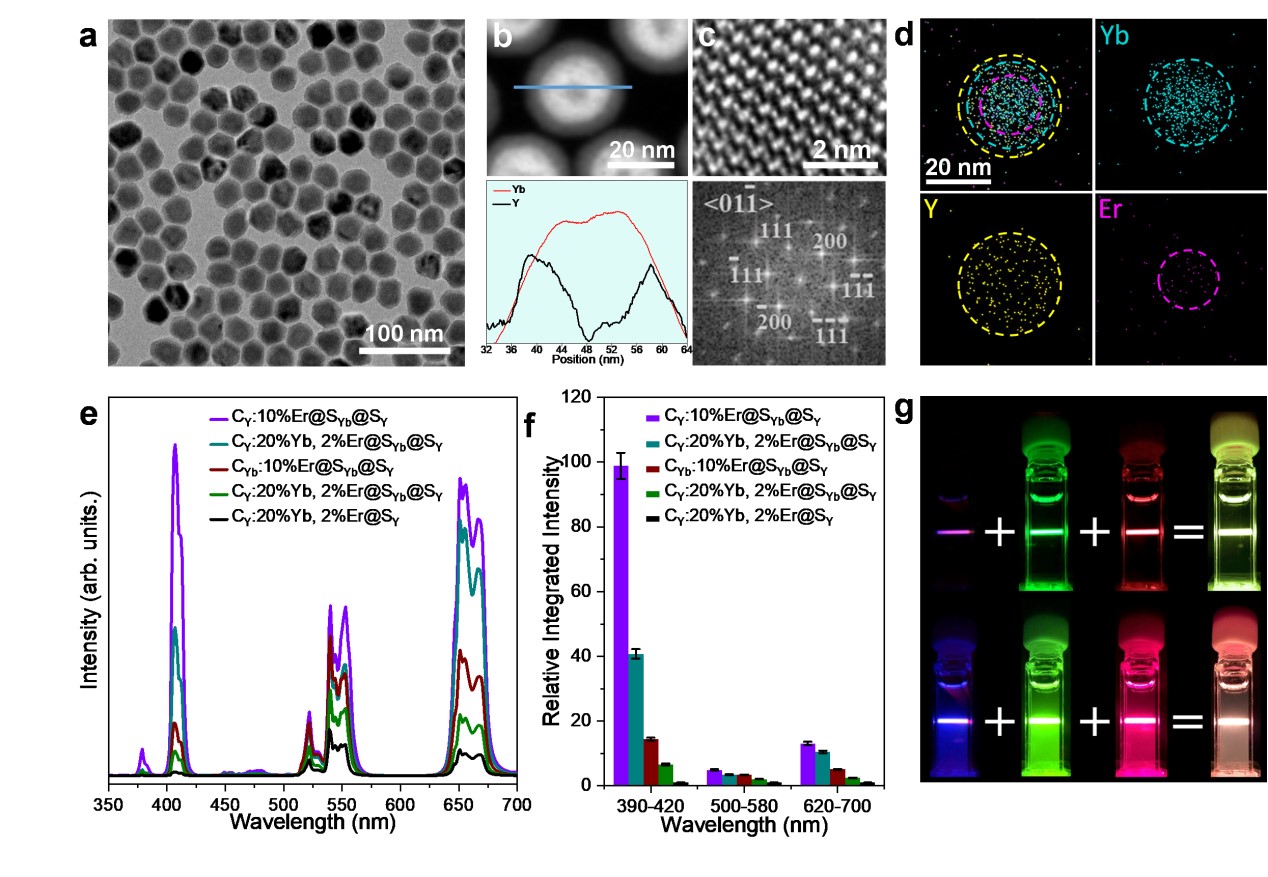 图2. 核-壳-壳纳米颗粒的电镜表征和显著增强的多光子上转换发光