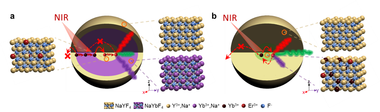 图1. NaYF4:Er@NaYbF4@NaYF4 核-壳-壳纳米颗粒的结构(a)和传统NaYF4:Yb, Er@NaYF4 共掺杂核-壳纳米颗粒的结构(b)示意图