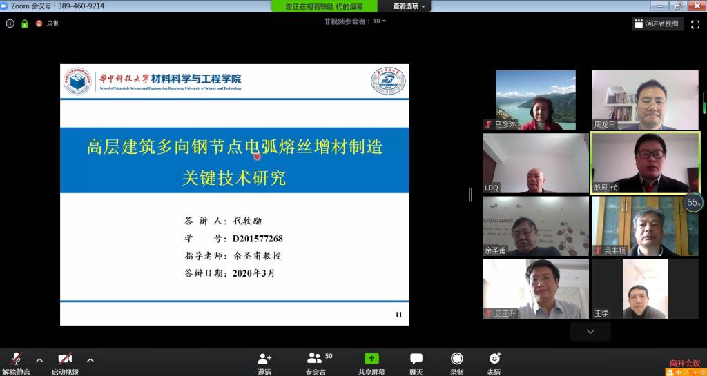 下午14时35分,答辩委员会主席史玉升教授宣布学院历史上第一次视频研究生毕业答辩正式开始。答辩会上,代轶励同学宣读了《学位论文独创性申明》,承诺遵守学术规范,独立完成答辩。并通过PPT展示的方式,汇报了学位论文《高层建筑多向钢节点电弧熔丝增材制造关键技术研究》的整体内容与写作思路。答辩委员们一边认真聆听,一边就相关问题依次向代轶励同学进行提问,整个答辩流程紧凑有序。